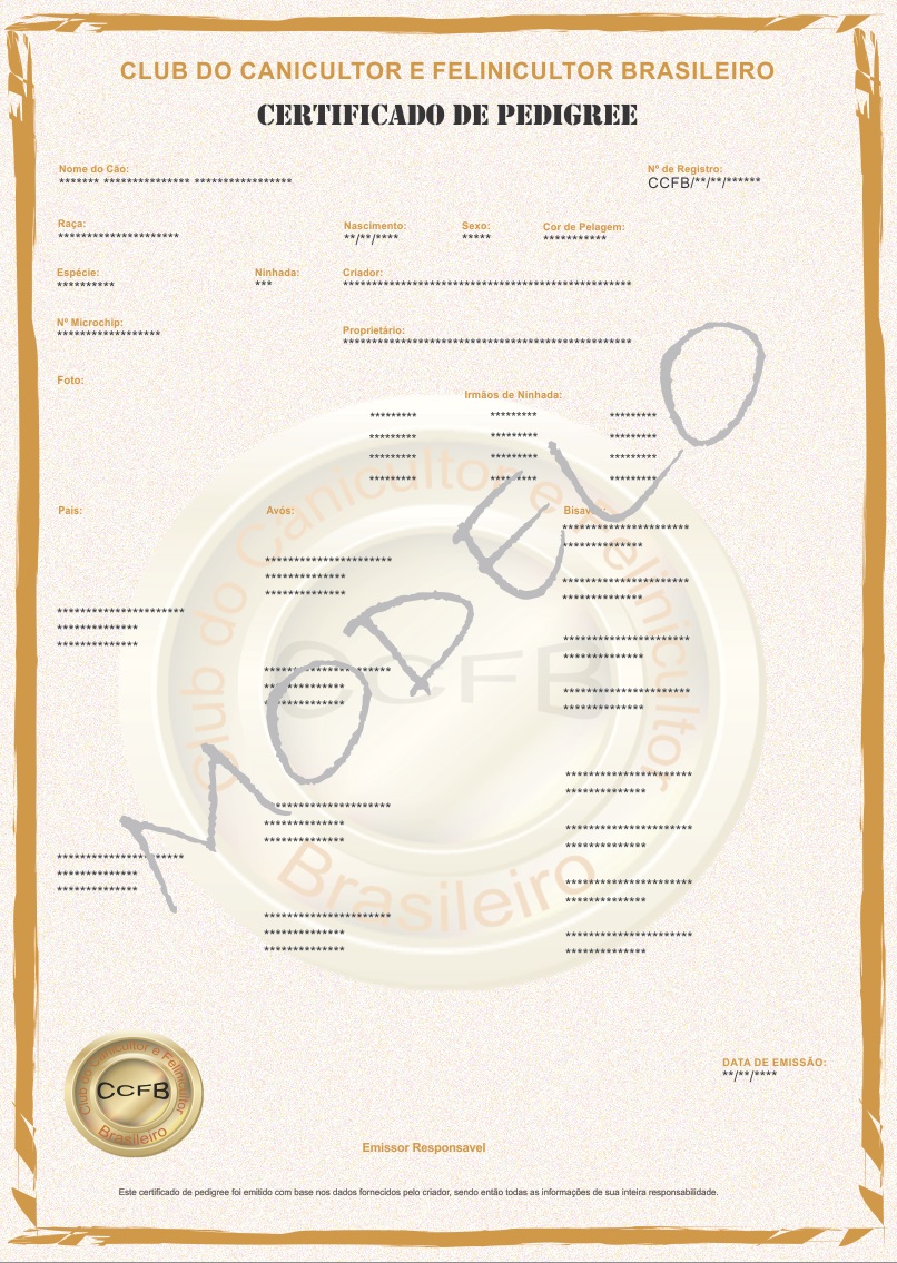 - O Pedigree de Primeiro Registro sai sem nenhuma Árvore Genealógica. Para o pedigree com árvore genealógica deverá ser solicitado um registro de ninhada onde os pais deverão ter pedigree.